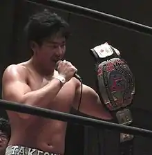 ![]() El actual campeón Konosuke Takeshita en 2016, con el diseño actual del campeonato. | |||||||||