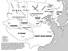 Los Oirat eran originarios del área de Tuva a principios del siglo XIII. Su líder, Quduqa Bäki , se sometió a Genghis Khan en 1208 y su casa se casó con las cuatro ramas de la línea Genghisid. Durante la Guerra Civil Toluid, los Cuatro Oirat (Choros, Torghut, Dörbet y Khoid) se pusieron del lado de Ariq Böke y, por lo tanto, nunca aceptaron el gobierno de Kublaid. Después del colapso de la dinastía Yuan, los Oirat apoyaron al Ariq Bökid Jorightu Khan Yesüder para apoderarse del Yuan del Norte.trono. Los Oirat dominaron los Yuan khans del norte hasta la muerte de Esen Taishi en 1455, después de lo cual emigraron al oeste debido a la agresión mongola de Khalkha.[2] En 1486, los Oirat se vieron envueltos en una disputa sucesoria que le dio a Dayan Khan la oportunidad de atacarlos. En la segunda mitad del siglo XVI, los Oirats perdieron más territorio frente a los Tumed.[3]