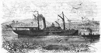 - El vapor Welf , de 36 m, en la exploración del río Juba, junto a un pequeña embarcación de 9 m.