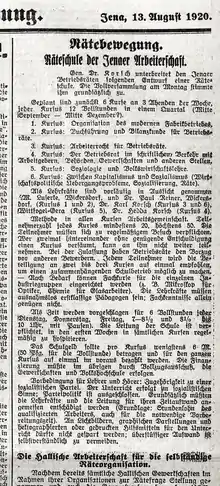 - «Räteschule der Jenaer Arbeiterschaft», Neue Zeitung, 2.º año, n.º 177, p. 1, columna derecha. Debido a un error tipográfico, se indica de manera incorrecta que el ejemplar pertenece al tercer año editorial; no obstante, según el archivo municipal (Stadtarchiv Jena) corresponde al segundo.