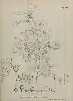 Arbusto o pequeño árbol de entre 1 a 8 m de alto, con un tronco que puede llegar a medir 20 cm de diámetro. Las hojas son pequeñas (1 a 1,5 mm de largo), verde brillante más pálido en el envés, con manchas negras en las nervaduras principales, opuestas y con estípulas lineares. La inflorescencia surge en cimas axilares con flores solitarias o en escaso número. Flores sésiles o con pecíolo corto, con pétalos de color blanco amarillento y glándulas oscuras en los bordes de los sépalos. El fruto subgloboso, de unos 6 a 9 mm de diámetro, es de color negro brillante; contiene 2 o 3 semillas también negras al madurar.