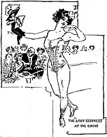 - Esbozo de Marguerite Martyn de 1911, donde se representa a sí misma alzada por la artista de fuerza en la pista, ante el público.