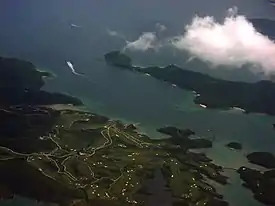 Kau Sai Chau está conectado en el norte por un espigón (rompeolas) con la pequeña isla Yim Tin Tsai. El extremo sur de la isla está separada por un estrecho canal de la Isla Jin (Tiu Chung Chau).