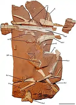 El espécimen holotipo, CP.V 2069, fue hallado en la capa de huesos C, en una arenisca. En principio se creyó que los estratos en los cuales los fósiles fueron descubiertos pertenecían a la Formación Rio Paraná pero posteriormente fueron asignados a la Formación Goio-Erê. La edad de esta formación está en discusión; podría ser tan antigua como el Aptiense pero también tan reciente como el Campaniense. El holotipo consiste de un esqueleto parcial con cráneo. Incluye el hocico, un hueso cuadrado, mandíbulas, dos vértebras cervicales, cuatro vértebras dorsales, el esternón, costillas gastrales, la escápula derecha, dos húmeros, un radio, dos fémures, una tibia, el ilion izquierdo, el pubis derecho y el isquion izquierdo. El esqueleto no está articulado. Los huesos se preservaron en tres dimensiones en su mayoría, con poca compresión. Los restos corresponden a un individuo subadulto.[1]