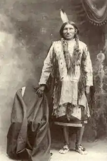 Kicking Bear (1846-1904), también llamado Mato Wanartaka, fue un Oglala Lakota que llegó a ser jefe de los Minneconjou Lakota Sioux. Luchó en varias batallas durante la Guerra de las Black Hills, incluyendo la Batalla de Little Big Horn. También curandero y chamán, fue activo en el movimiento religioso de la Ghost Dance de 1890, y viajó con su compañero Lakota Short Bull para visitar al líder del movimiento, Wovoka (un chamán Paiute de Nevada). Los dos Lakota fueron fundamentales para llevar el movimiento a su pueblo, que vivía en reservas en Dakota del Sur. Tras el asesinato de Toro sentado, Kicking Bear y Short Bull fueron encarcelados en Fort Sheridan, Illinois. Hasta su liberación en 1891, ambos se unieron al Wild West Show de Buffalo Bill, y viajaron con el espectáculo. Artista dotado, Kicking Bear pintó su versión de la Batalla de Greasy Grass a requerimiento del pintor Frederic Remington en 1898, más de veinte años tras la batalla.