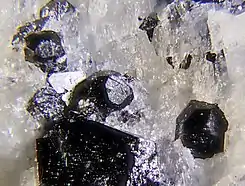 Las muestras encontradas en la cueva Magnet estaban asociadas con otros minerales como: apatita, calcita, monticellita, magnetita, perovskita, anhidrita, vesuvianita, biotita y pirita.[2]