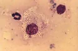 ![]() Cuerpos de Donovan en el interior de un leucocito. Estas inclusiones intracelulares contienen ejemplares de K. granulomatis. | ||