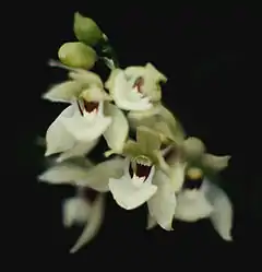 Las flores son normalmente blanquecinas o teñidas de rojo o púrpura. Los sépalos y pétalos similares, más o menos planos. El labio es unguiculado, trilobulado , el lóbulo central es triangular y los laterales, oblongos, erigidos en paralelo a la columna, la cual presenta, cerca de la base, una verruga prominente, carnosa bilobulada, mirando hacia atrás. La columna tiene un pie, corto y carnoso, ampliada al final, con dos pares de polinias cerosas.
