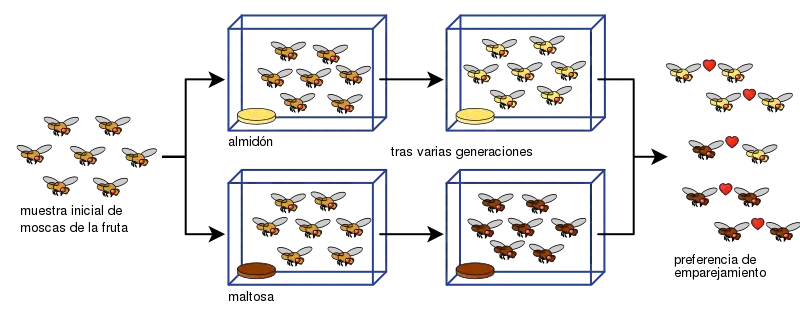 Las creaciones mejor documentadas de nuevas especies en el laboratorio se realizaron a fines de la década de 1980. William Rice y G. W. Salt criaron moscas de la fruta (Drosophila melanogaster) utilizando un laberinto con tres opciones diferentes de hábitat, tales como claro/oscuro o húmedo/seco. Cada generación se colocó en el laberinto, y los grupos de moscas que eligieron dos de las ocho salidas se separaron para reproducirlas entre sí dentro de sus respectivos grupos. Después de treinta y cinco generaciones, los dos grupos y sus crías se aislaron reproductivamente debido a sus fuertes preferencias de hábitat: se aparearon solo dentro de las áreas que prefirieron, por lo que no se aparearon con moscas que preferían las otras áreas.[56] La historia de tales intentos se describe en Rice y Hostert (1993).[57][58]