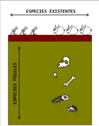 La especiación plantea un problema "bidimensional". Las discontinuidades en la apariencia entre las especies existentes representan la "dimensión horizontal" del problema. La sucesión de especies fósiles representa la "dimensión vertical" |