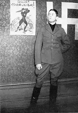 ![]() Konrad Hallgren en los años 20. El cartel de propaganda en la pared dice "muerte al comunismo" en sueco. | ||