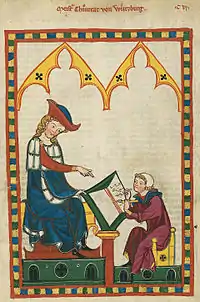 ![]() Retrato de Konrad von Würzburg del Codex Manesse (folio 383r). | ||