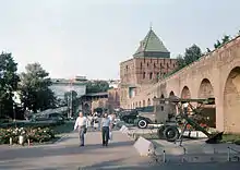 Desde 1980, el memorial militar-patriótico “¡Gorky por el frente!” Ha sido ubicado en el territorio del Kremlin. Presenta el equipo militar que Gorky suministró al ejército soviético al Frente Oriental de la Segunda Guerra Mundial para combatir a las tropas nazis. A la entrada del monumento hay un letrero conmemorativo revestido con losas de granito. En una de las planchas está grabado el texto: “De generación en generación, se transmitirán palabras sobre quienes defendieron la Patria Soviética con armas en la mano en una época de terribles pruebas, y sobre quienes forjaron armas, quienes construyeron tanques y aviones, que cocinaban acero para proyectiles que, con sus hazañas laborales, eran dignos del valor militar de los soldados. Pravda, 8 de junio de 1942”. En otra losa de granito están grabadas las palabras: “Se han entregado al frente 2.360 tanques, 1.500 aviones, 9.000 cañones autopropulsados, 10.000 morteros. Las empresas de la ciudad produjeron vehículos de combate Katiusha y otro equipo militar”.
