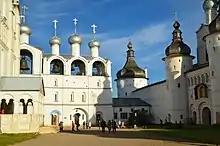 El Kremlin está agradablemente dispuesto a lo largo de las riberas del lago Nero. Aunque construido casi doscientos años después del Kremlin de Moscú, en el siglo XVII, el Kremlin de Rostov ofrece una apariencia más medieval. Las iglesias, en lugar de agruparse dentro del recinto, como en Moscú, se reparten en la periferia. La mayoría de ellas se abren en el primer piso, por encima de las puertas del recinto y están flanqueadas por dos torres grandes. Conectadas por un camino de ronda, contribuyen a la defensa de la ciudadela eclesiástica.[3] Las principales edificaciones son: