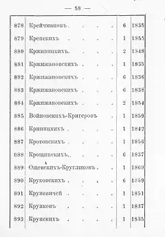 El linaje fue reconocido entre la nobleza del distrito de Moguiliov el 16 de marzo de 1799[28] y el 12 de noviembre de 1811[29] como «antiguo linaje de nobleza»,[30] siendo inscrito en la 6-ta parte del Libro de Genealogías de Familias Nobles. Una gran parte de las familias del linaje no fue aprobada entre la nobleza rusa y fue inscrita entre los gremios sociales que pagaban tributos. Otras ramas del árbol genealógico fueron inscritas en los Libros de Genealogías de Familias Nobles de los distritos de Minsk,[31] Vítebsk,[32] Vilna,[33] Kovno,[34] Volhynia,[35] Podolia[36] y Kiev.[37] También había representantes del linaje en el Imperio Austro-Húngaro.