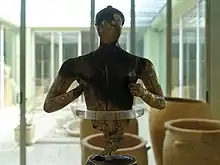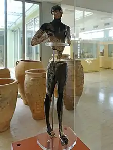 Las piernas de la figura se encontraron frente a una pared de la habitación 2 del edificio 5, que se interpreta como un santuario y en el que se encontraron un ánfora y dos copas. Las otras partes de la estatuilla, como el torso, la cabeza, los ojos, la mitad delantera de los pies y los restos de la base se encontraron en la entrada a la sala 1 del mismo edificio, una platea abierta situada al noroeste del edificio 1.