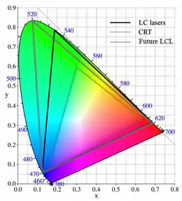 LCL es capaz de proyectar diferentes colores con un mismo flujo láser gracias a que cristal líquido se excita con un campo de gradiente, de manera que puede haber variaciones dentro de una misma celda al contrario que en LCD, donde cada celda de cristal líquido actúa como llave de paso de la luz. Gracias a la flexibilidad del cristal líquido y la pureza del láser es capaz de alcanzar un gran rango de colores (longitudes de onda) y contrastes superiores a 30.000:1 en televisores.