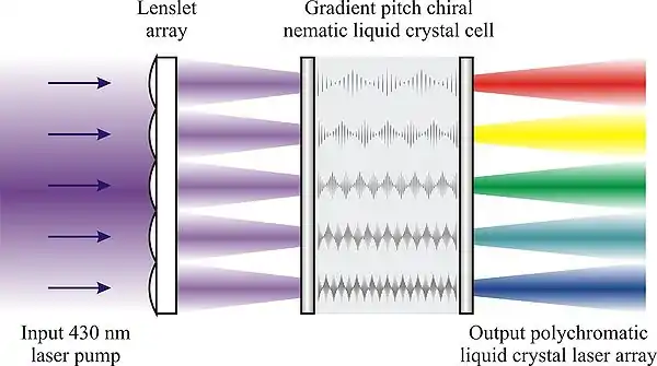 Los LCL tienen muchas ventajas respecto a los láseres semiconductores. En primer lugar, podemos la longitud de onda a la salida del láser con un simple ajuste a la banda fotónica del cristal líquido. Además, el speckle puede reducirse mediante el uso de una fuente láser de longitud de onda corta o mediante el ajuste del material de cristal líquido para crear una mayor anchura de línea para la iluminación de salida. Por último, sólo una fuente láser es necesaria para LCL, reduciendo los costes del sistema y su complejidad.