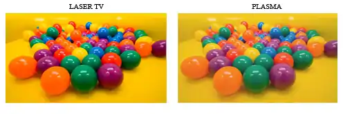 - — Es una tecnología muy reciente y aún se está mejorando. Uno de los aspectos donde hay campo de mejora es en la proyección de láseres verdes, actualmente se está intentando proyectar verdes de 520nm, por lo que se ampliaría notablemente el rango de colores que puede representar.