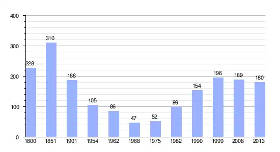 Los datos demográficos contemplados en este gráfico de la comuna de Lézat[4] se han cogido de 1800 a 1999 de la página francesa EHESS/Cassini, y los demás datos de la página del INSEE.[5]