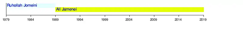 El Líder Supremo se ubica por encima del Presidente de Irán y nombra personalmente a los jefes de las fuerzas armadas, el gobierno y el poder judicial.[17] Originalmente, la constitución requería que el Líder Supremo fuera un Marya Taqlid, el clérigo de más alto rango en las leyes religiosas de Usuli Imaní Chií. Sin embargo, en 1989, la constitución fue enmendada y simplemente solicitó una «beca» islámica, por lo que el Líder Supremo podría ser un clérigo de menor rango.[18][19]