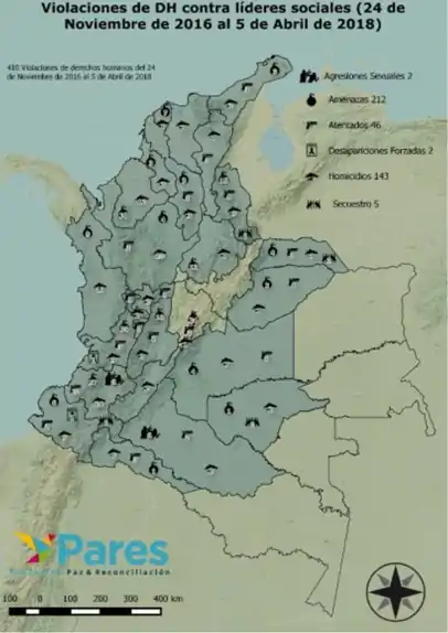 Desde la firma de los acuerdos de paz entre el gobierno y las FARC-EP, se han incrementado los asesinatos contra líderes sociales.[32] Más de 300 líderes han sido asesinados desde el 1 de enero de 2016 las cifras varían según la fuente. Han sido 357 asesinatos de líderes sociales en Colombia ocurridos entre 2012 y 2017 según El País.[33] Según El Espectador en 2019 fueron más de 120 los asesinatos [34] Según la Coordinación Social y Política Marcha Patriótica, La Cumbre Agraria, Campesina, Étnica y Popular (CACEP), y el Instituto de Estudios sobre Paz y Desarrollo (Indepaz) a nivel Nacional entre el 1 de enero de 2016 y 8 de septiembre de 2019, 777 personas líderes sociales y defensoras de Derechos Humanos han sido asesinados en Colombia. 132 casos ocurrieron en el año 2016, 208 en el año 2017, 282 en el año 2018 y 155 en el año 2019 (corte 8 de septiembre de 2019).[35]