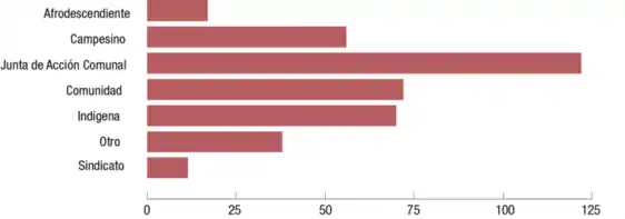- Líderes comunitarios o comunales: asociados a la defensa de territorios y de los Derechos Humanos y a la participación política de la comunidad. Algunos pertenecen a las Juntas de Acción Comunal.