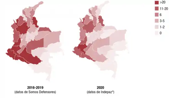 En 2020 hasta el 14 de enero se reporta el asesinato de 18 líderes sociales en lo corrido del año.[42] Los departamentos más afectados han sido Cauca, Putumayo, Antioquia, Huila, Chocó, Cesar y Norte de Santander.[43] Hasta el 9 de abril se reportan 36 asesinatos líderes y defensores de derechos humanos verificados, pero la cifra puede aumentar a 60.[44] El 25 de abril fue asesinado un líder social de la Sierra Nevada de Santa Marta,[45] El 29 de abril de 2020 se reportan 16 líderes asesinados durante 2020 en el Cauca, en medio de las disputas territoriales entre narcotraficantes, GAO y disidencias de las FARC-EP.[46]