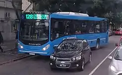 ![]() Unidad de la línea 128, ramal Negra, estrenado en noviembre de 2018 con el nuevo esquema para las líneas principales del nuevo transporte urbano de pasajeros de Rosario. | ||