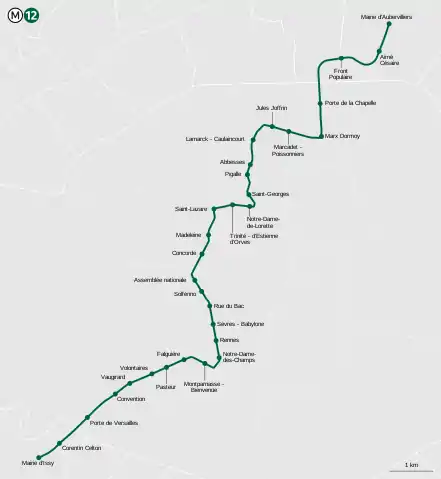 La línea 12 del Metro de París une las estaciones de Mairie d'Aubervilliers y Mairie d'Issy atravesando París de norte a suroeste.
