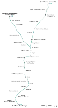 La línea 13 del metro de París es el resultado de la fusión entre la antigua línea B de la red de ferrocarril de la Compañía Nord-Sud y la antigua línea 14 de la CMP. Une, atravesando París, los municipios de Saint-Ouen, Saint-Denis, Clichy, Asnières-sur-Seine y Gennevilliers al norte con Malakoff, Châtillon y Montrouge al sur.