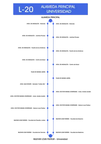 Desde la primera parada, toma el bulevar de Louis Pasteur y a la altura de Gregorio Prieto gira a la derecha hasta el final. En la rotonda, gira a la izquierda para incorporarse a la Avenida Blas Infante. Llega a la Plaza de Manuel Azaña y desde ahí continúa por la Avenida de Andalucía, hasta el final de la calle para acabar su recorrido en la Alameda.
