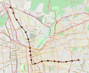 1. Existen discrepancias sobre la longitud real de la Línea 3, ya que las primeras informaciones señalaban una extensión de 20,1 km;[3] sin embargo, la cifra de 22 km incluiría la extensión de 1,7 a 2 km que estaba planteada desde Fernando Castillo Velasco hasta Hospital Militar, tramo que fue anunciado pero finalmente no fue construido.[4][5][6]