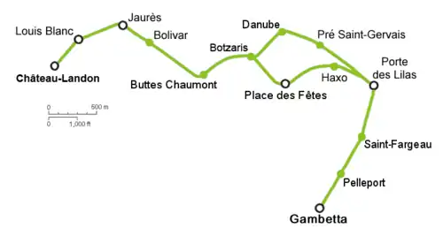 - La estación de Place des Fêtes sólo tiene servicio en dirección Pré-Saint-Gervais, pero tiene dos vías y andén central porque la vía situada al norte sirve de apartadero.