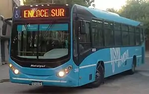 ![]() Interno 366 de la línea Enlace Sur, cuya propietaria es la empresa Movi | ||