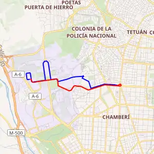 La línea tiene recorridos diferentes en cada sentido, así cuando se dirige a la Facultad de Filosofía B, la línea rodea el Paraninfo, mientras que en dirección a Cuatro Caminos no pasa por el mismo. De igual manera, la bajada y la subida desde el final de la Avenida de Reina Victoria a la Ciudad Universitaria de Madrid se hacen por diferentes vías.