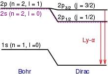 Debido a las perturbaciones de estructura fina, la línea Lyman-alfa se divide en un doblete con longitudes de onda 1215,668 y 1215,674 angstroms. Específicamente, debido a la interacción espín-órbita del electrón, los estados propios estacionarios del Hamiltoniano perturbado deben estar marcados por el momento angular total j del electrón (espín más orbital), no solo por el momento angular orbital l. En el orbital n = 2, hay dos estados posibles, j =12 y j =32, resultando en un doblete espectral. La j =32 El estado es de mayor energía (menos negativo) y, por lo tanto, está más alejado energéticamente del orbital n = 1 al que está haciendo la transición. Por lo tanto, la j =32 El estado se asocia con la línea espectral más enérgica (longitud de onda más corta) en el doblete. [1]