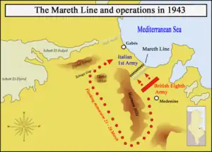 Después Montgomery recibió información que aseguraba que la línea podía ser flanqueada por el sur, como así se hizo. Pero el Afrika Korps, ahora bajo el mando del general italiano Giovanni Messe, logró escapar de la captura y se retiró a la línea defensiva del río Akarit, junto a Gabès, 60 km al norte.