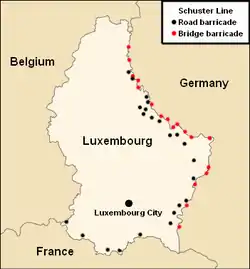 La línea Schuster constaba de cuarenta y un juegos de bloques de hormigón y puertas de hierro; dieciocho bloqueos de puentes en la frontera alemana y cinco bloqueos de carreteras en la frontera francesa.[2] Las barricadas se colocaron a una milla en el interior del país siguiendo un patrón en zigzag, cubiertas por densas barreras de alambre de espinos a ambos lados. Se erigieron nueve puestos de radio a lo largo de la frontera alemana, con una estación receptora central en el cuartel de St Espirit en la capital.[3]