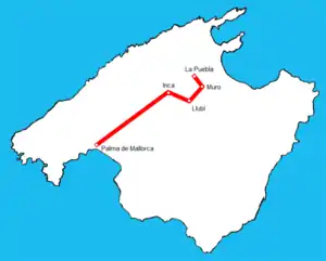 Esta línea tiene su origen en la Estación Intermodal de Plaza de España, situada en el centro de Palma de Mallorca. Se trata de la principal estación ferroviaria de la capital autonómica así como intercambiador con buses urbanos e interurbanos y con el Metro de Palma de Mallorca. A partir de aquí la se dirige hacia Inca pasando por el Distrito de Levante y la denominada Comarca del Raiguer hasta llegar a la Estación de Inca, donde la línea se desvía hacia el sudeste hacia la Estación de Empalme. Allí finaliza el tramo de vía doble y el trazado se bifurca hacia La Puebla y Manacor. La primera vía continúa hacia en dirección norte hasta llegar a la Estación de La Puebla. Este último tramo se encuentra electrificado desde octubre de 2018.