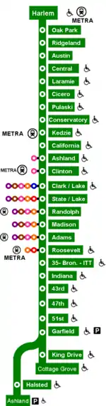 La línea Verde (en inglés: Green line) del Metro de Chicago comúnmente conocido como Chicago "L", consiste en 29 estaciones. La línea inicia en la estación Harlem en Forest Park/Oak Park a la estación Ashland/63rd y Cottage Grove en Engleewood y Woodlawn. La línea opera las dos secciones más antiguas del sistema, con segmentos que datan desde 1892.