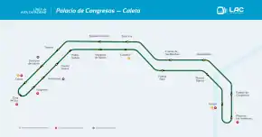 El trazado de la Línea de Alta Capacidad, en sentido Palacio de Congresos lo componen las paradas: «Villarejo», «Juzgados», «Andaluces», «Fuente Nueva», «Padre Suárez», «Marqués de Falces», «Catedral», «Puerta Real», «Puente Blanco» y «Violón». En sentido Caleta las paradas son «Violón», «Plaza de las Américas», «Palacio de Congresos», «Humilladero», «Fuente de las Batallas», «Gran Vía», «Sagrado Corazón», «Triunfo», «San Juan de Letrán», «Caleta» y «Villarejo».