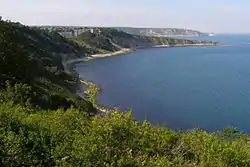 Parte de la costa de Dorset que se dispone hacia el norte desde la caliza de Portland en Durlston Head es un ejemplo claro de un línea de costa discordante. La caliza de Portland es resistente a la erosión; mientras al norte hay una bahía en Swanage donde el tipo de roca es una arenisca verde blanda. Al norte de Swanage, el afloramiento de tiza crea el promontorio que incluye Old Harry Rocks.