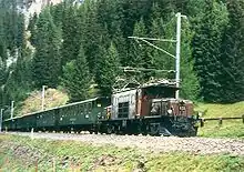 ![]() Un tren del Ferrocarril Rético pasando por los túneles en espiral | ||