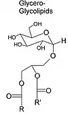 Los glicoglicerolípidos son lípidos compuestos por una molécula de glicerol unida a dos ácidos grasos y un resto azúcar por esterificaciones. Se parecen a los cerebrósidos, pero en vez de estar unido a una cerámida, el azúcar está unido a un glicerol.[9]