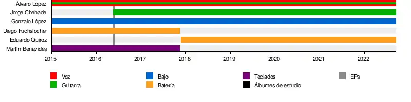 Hasta 2017 estaba también conformada por Diego Fuchslocher y Martín Benavides, tecladista de Francisca Valenzuela.[6]
