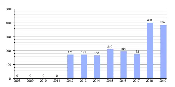 Gráfica de evolución demográfica de Lújar[2] entre 1842 y 2019 |