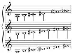 La otra transposición emplea la escala de tonos enteros, evitada en secciones externas, y proporciona más contraste armónico.