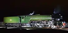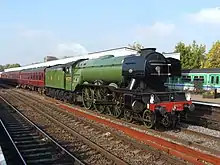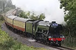 ![]() Flying Scotsman en el Ferrocarril West Somerset el 11 de septiembre de 2017, con la librea de color verde del BR, sus prominentes deflectores de humo de estilo alemán, y su doble chimenea | ||