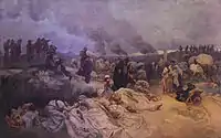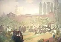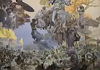 La Épica eslava (en checo: Slovanská epopej) es un ciclo de 20 grandes lienzos pintados por el pintor modernista checo Alfons Mucha entre 1910 y 1928. El ciclo muestra la mitología e historia de los checos y otros pueblos eslavos. En 1928, después de terminar su obra monumental, Mucha otorgó el ciclo en la ciudad de Praga, a condición de que la ciudad construyera un pabellón especial para ello.[1]Antes de 2012, la obra fue parte de la exposición permanente en el castillo de la ciudad de Moravský Krumlov, en la Región de Moravia Meridional de la República Checa. En 2012, los 20 trabajos fueron trasladados y son mostrados juntos en la planta baja del Palacio de Veletržní en una exposición organizada por la Galería Nacional de Praga (catálogo de la exposición: Alfons Mucha – Slovanská epopej).[2]